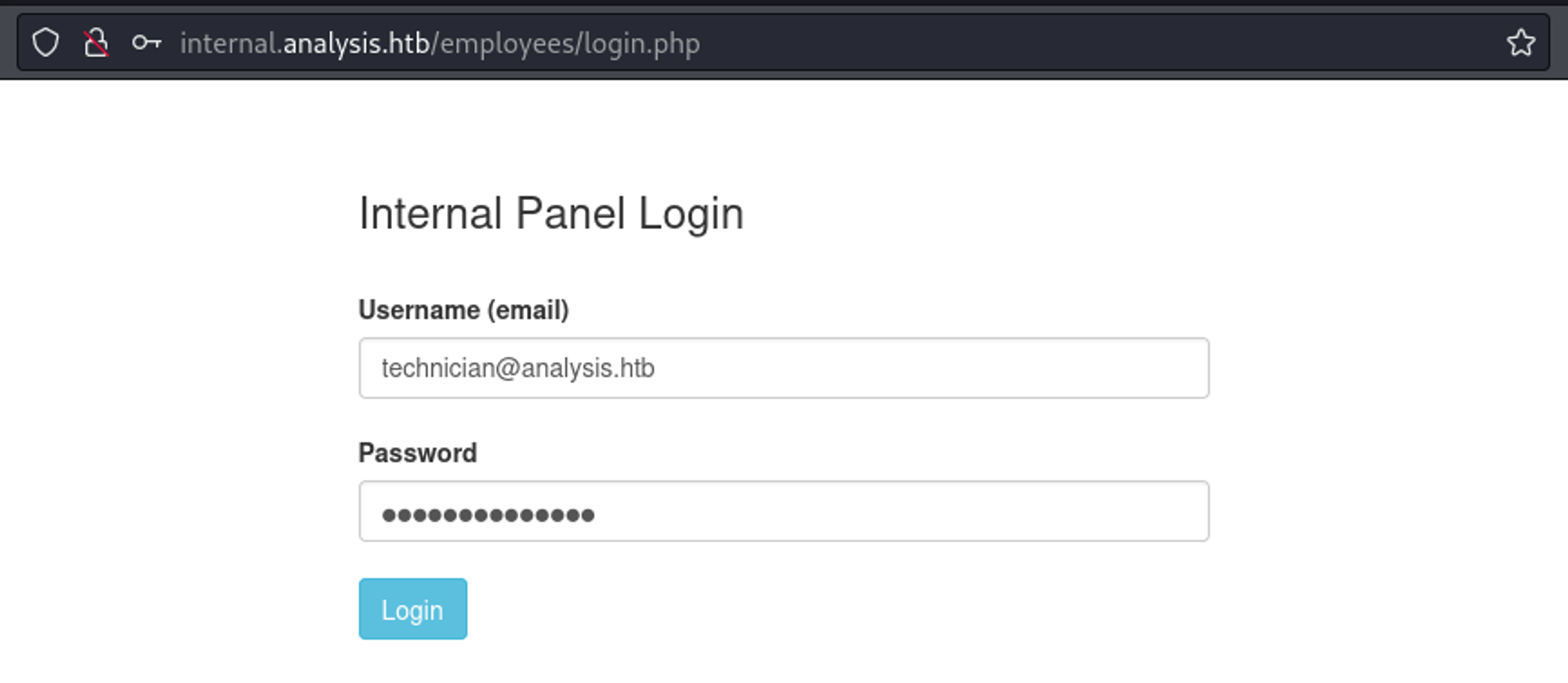 We can now log in as the technician user: technician@analysis.htb:97NTtl*4QP96Bv.