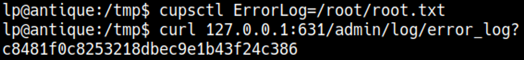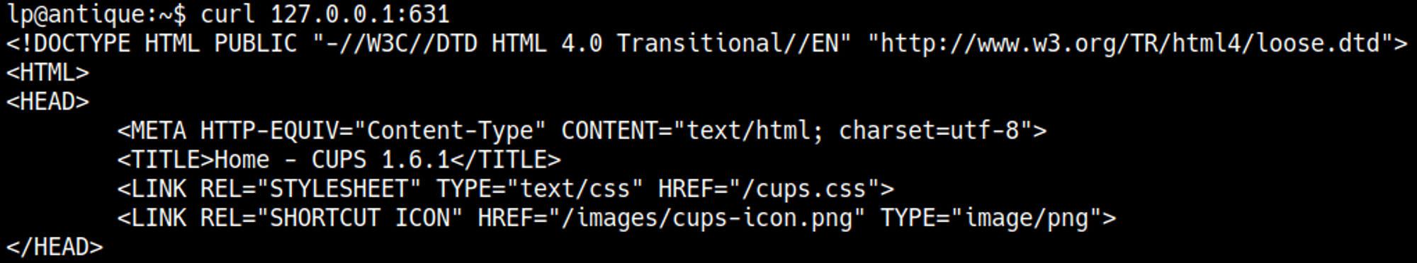By curling the page, we identified a CUPS server running version 1.6.1, which is vulnerable and may allow access to root-owned files.