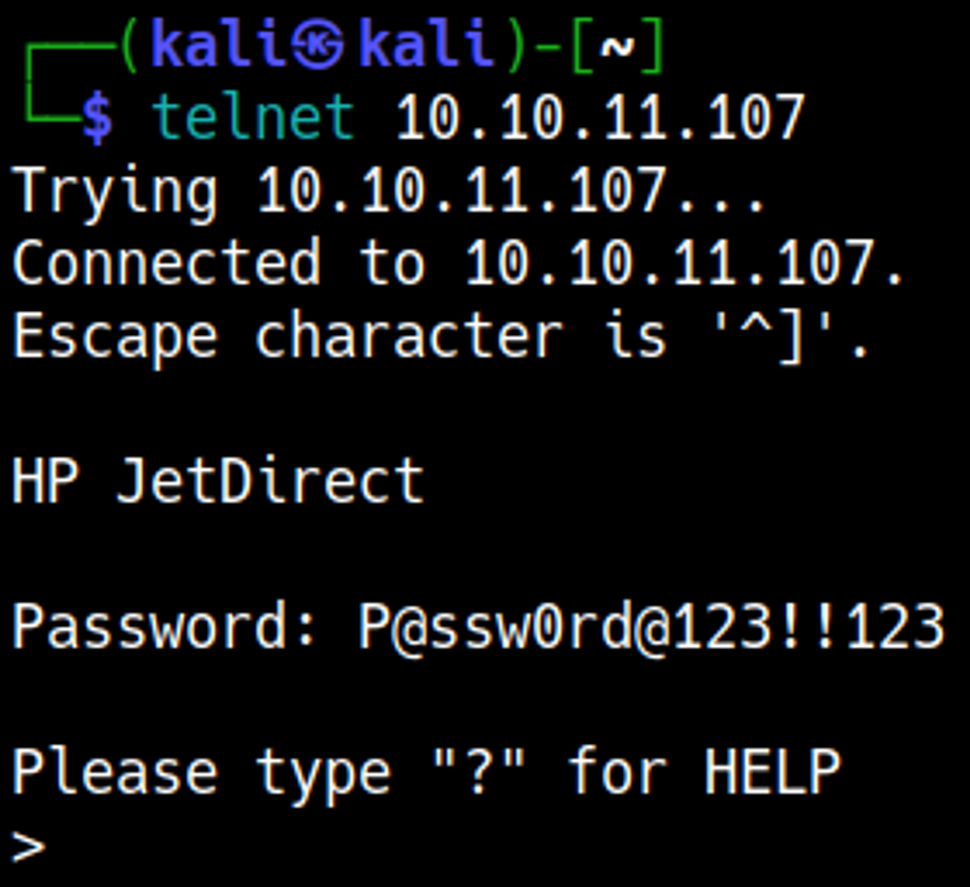 Following the SNMP information disclosure, we were able to use the password to authenticate to the Telnet service.