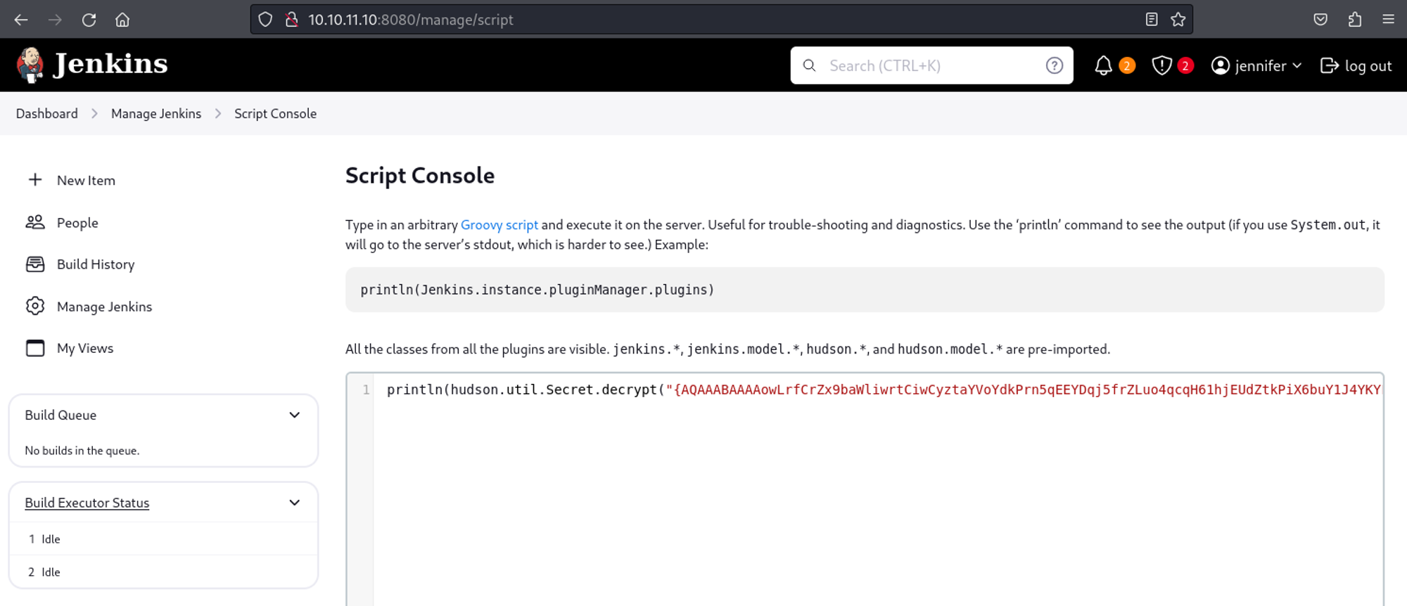 In the Jenkins script console we can write a script that will decode the value found earlier: Link