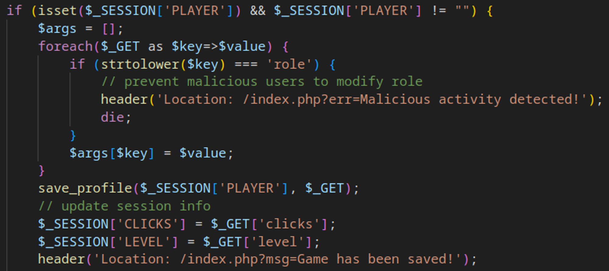 When saving a game, only 2 attributes are used, however in the save_game.php file, there are 3 attributes present, if we are able to bypass the following if statement we would be able to save our profile and become an administrator on the website.