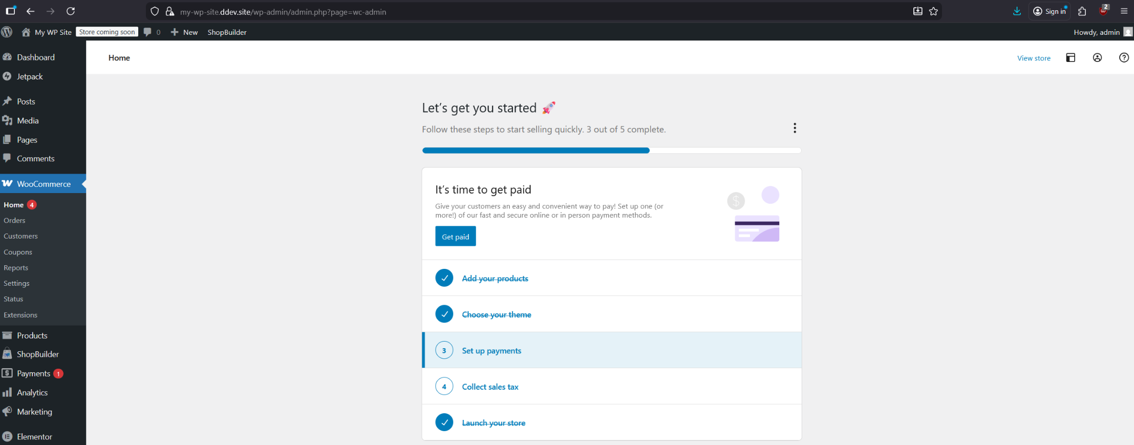 Use the guided setup for WooCommerce and complete the required fields. The default options are sufficient. After the installation, add a product but don’t select a theme. Next, press on “Launch your store”.
