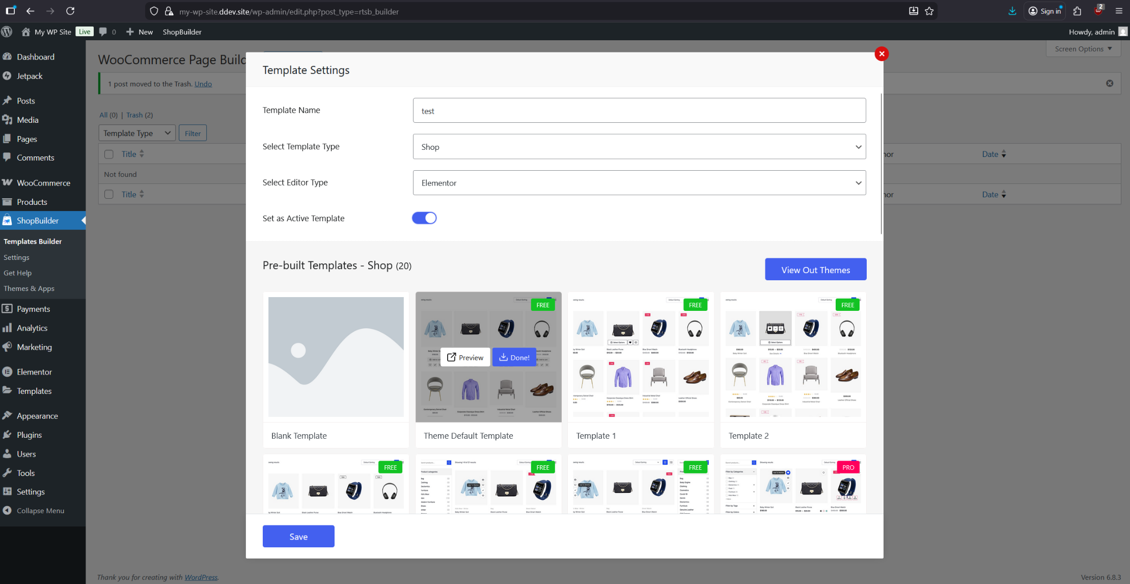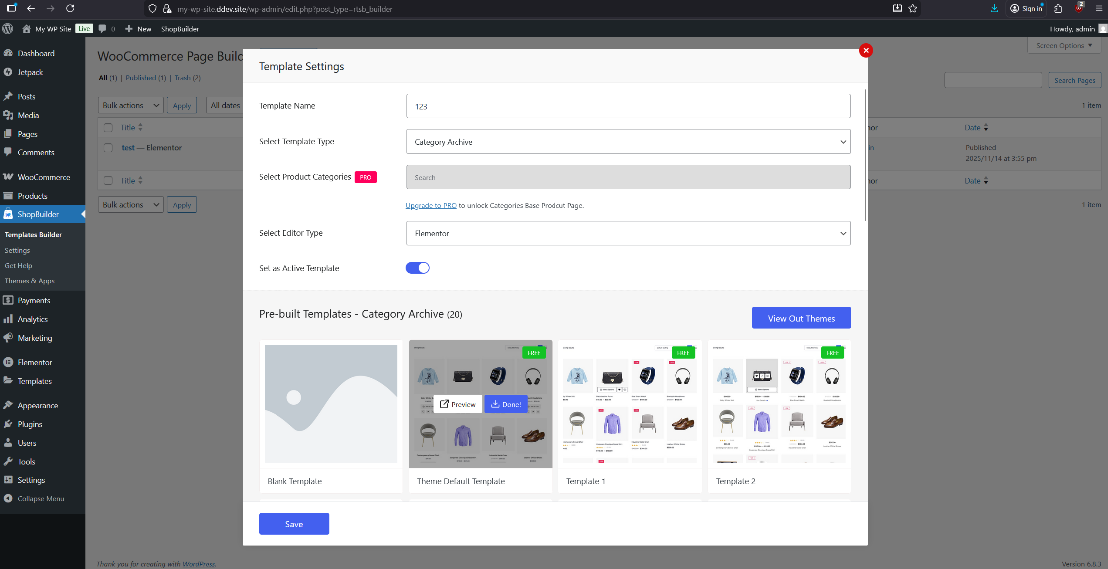 Add a new page using the “Shop” template in the Shopbuilder plugin settings, and configure the theme to use the default template.