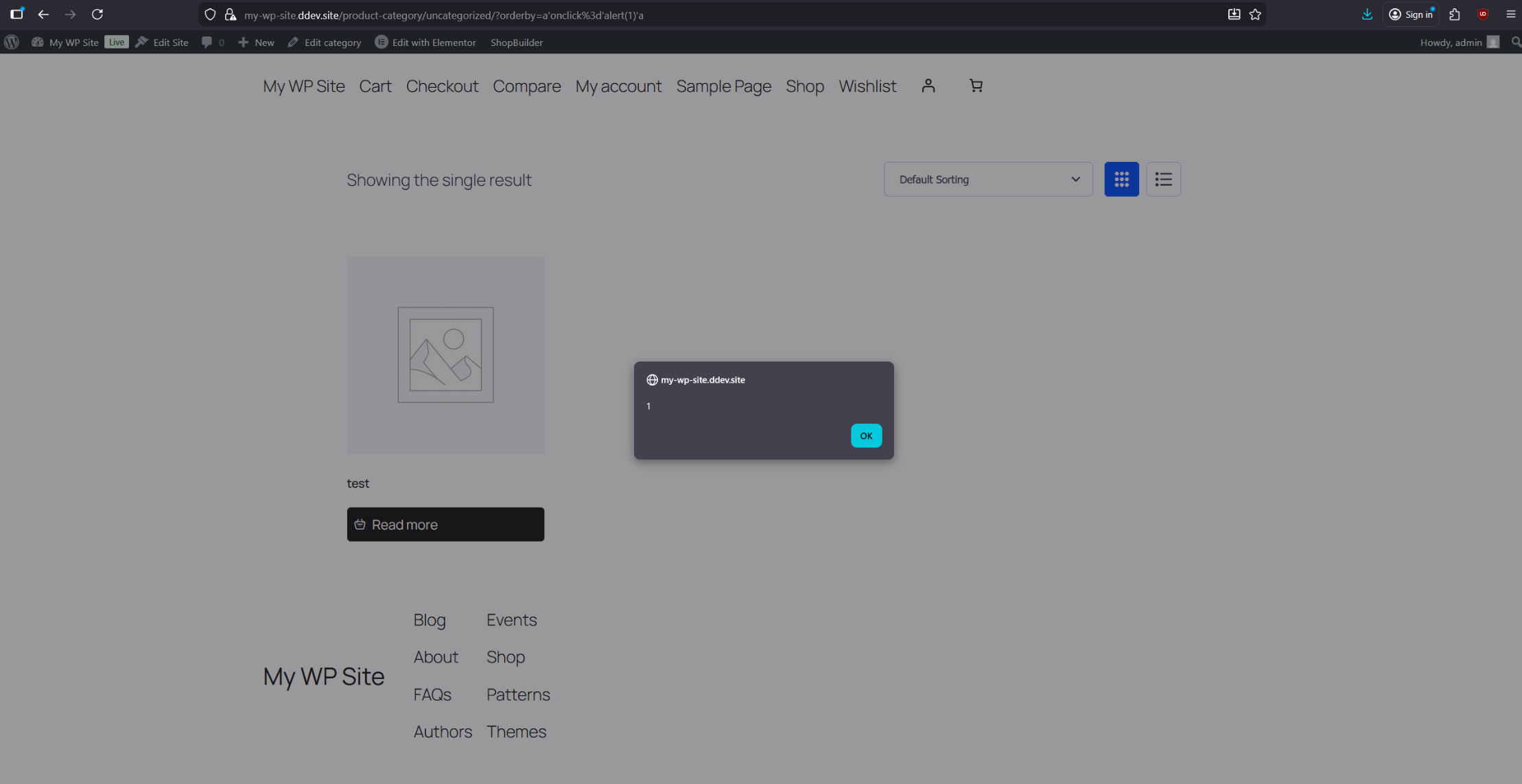 The XSS can now be triggered through the previously exposed orderby parameter. Navigate to the /product-category/uncategorized page and adjust the sorting options so the parameter becomes visible. Once it appears, use the following URL-encoded XSS payload. Clicking anywhere on the page should then trigger an alert: