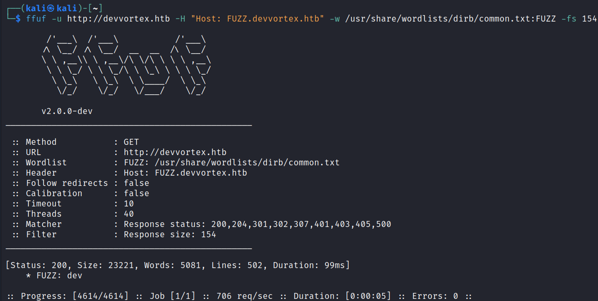 Located the dev subdomain using ffuf (add the subdomain to the hosts file).