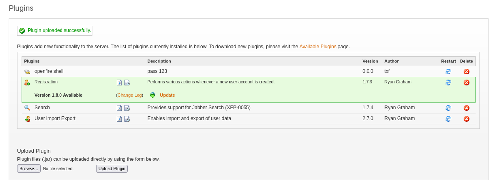 Use the following jar file plugin to get RCE: Link. Upload the jar file.