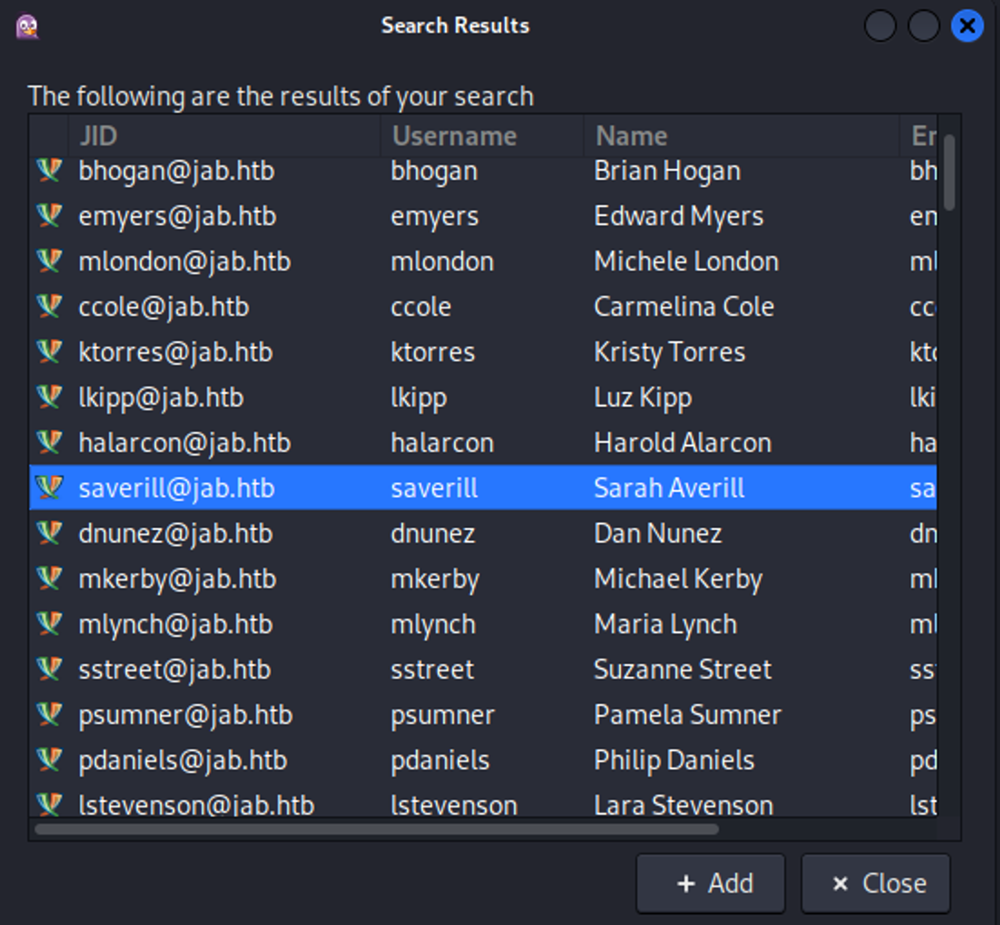└─$ grep -oP '<value>\\K[^<]+@jab.htb(?=</value>)' log.log | sed 's/@jab.htb//g' | sort | uniq > filtered