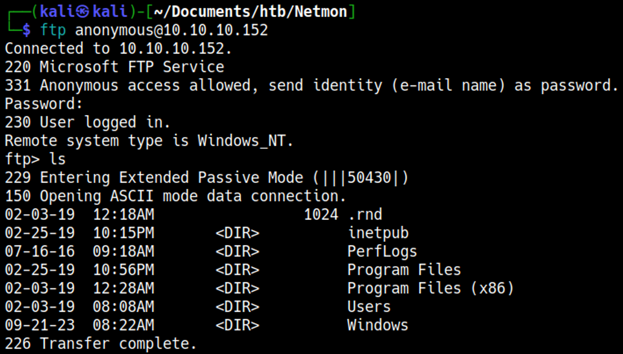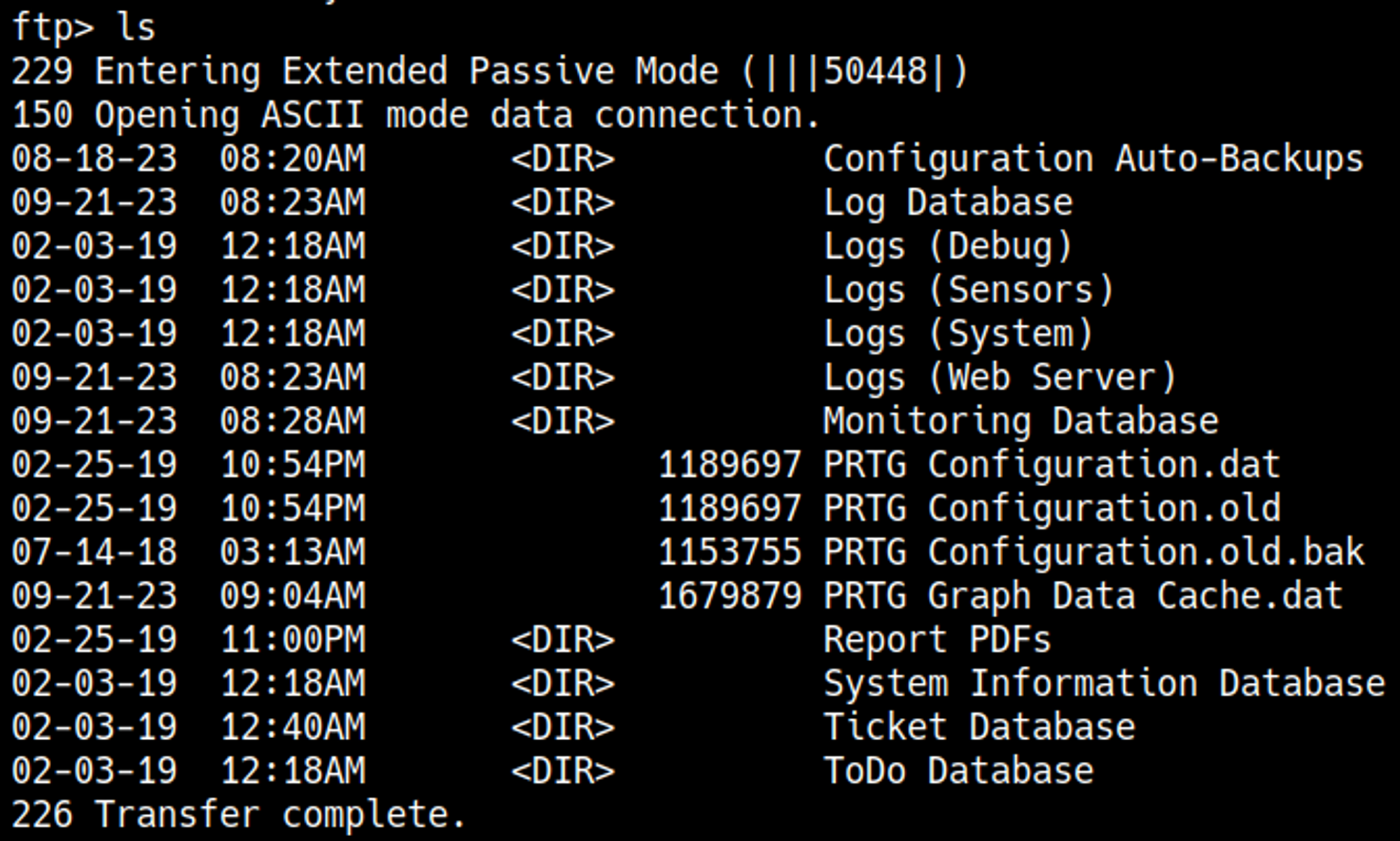 From the Nmap scan we also know that prtg network monitor is running on the system, we could find configuration files regarding this service to get a password, after googling around and testing a bit on the ftp server I ended up finding the following directory.