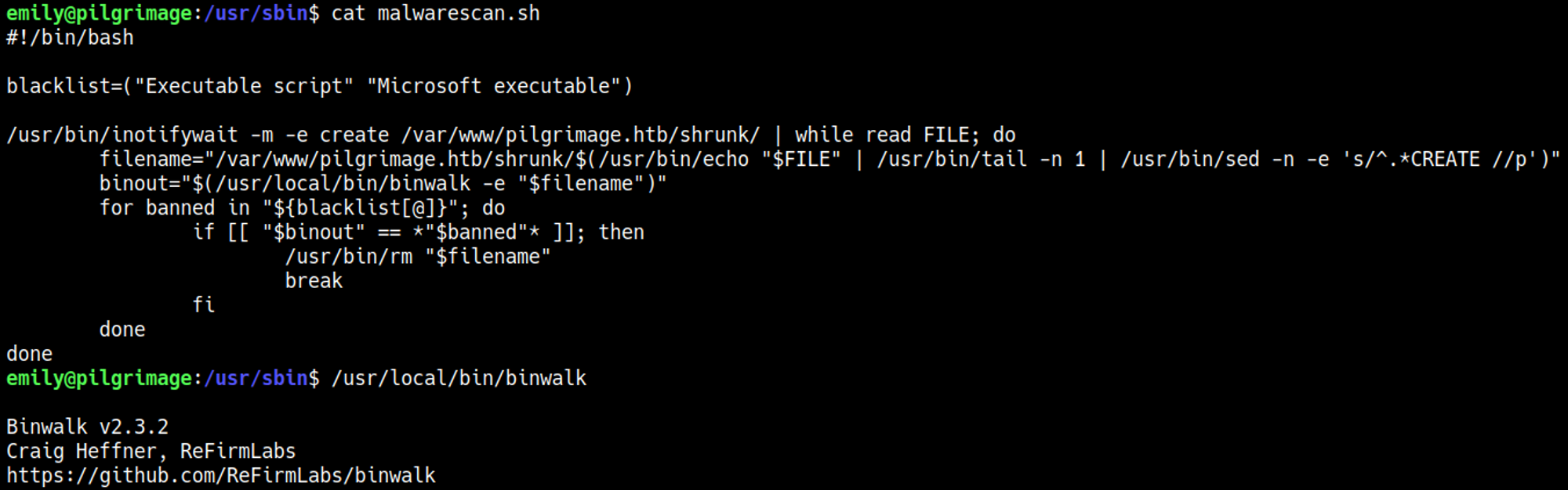 The malware.sh script uses a deprecated and vulnerable version of binwalk.
