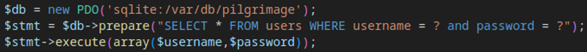 In login.php we find a file location that is being used for database credentials /var/db/pilgrimage, using our previously mentioned exploit we can retrieve this file and get some credentials.