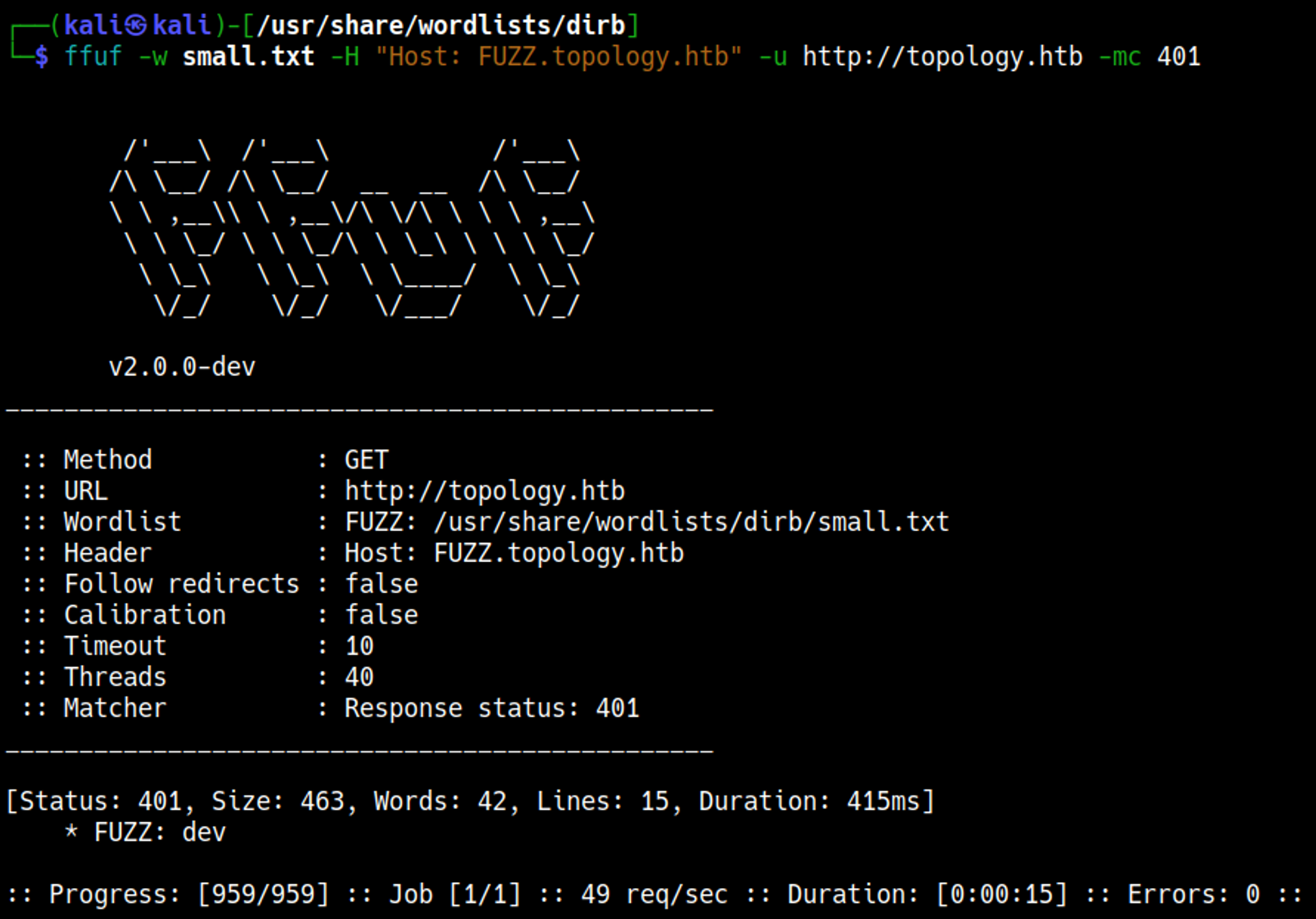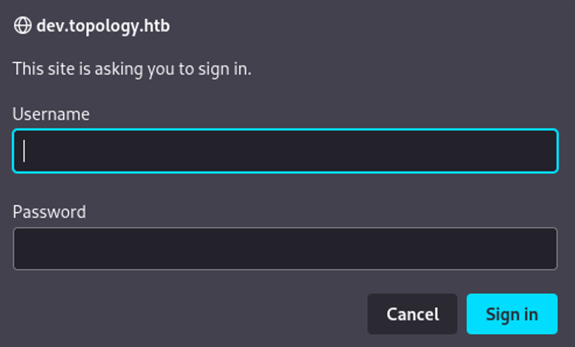 Trying to access dev.topology.htb results in a login prompt, info could be stored in a .htpasswd file?